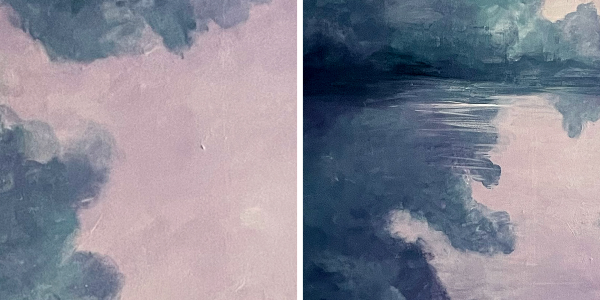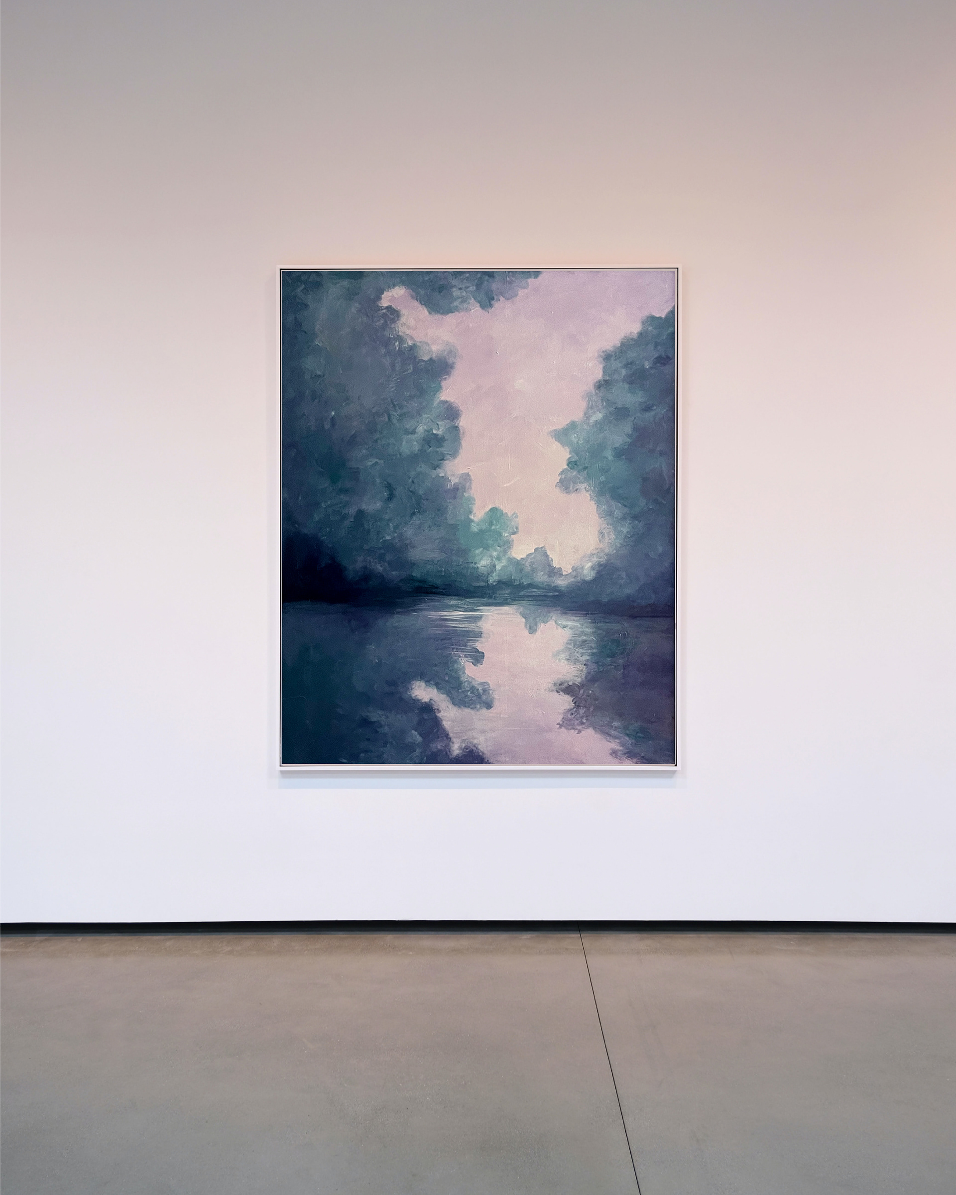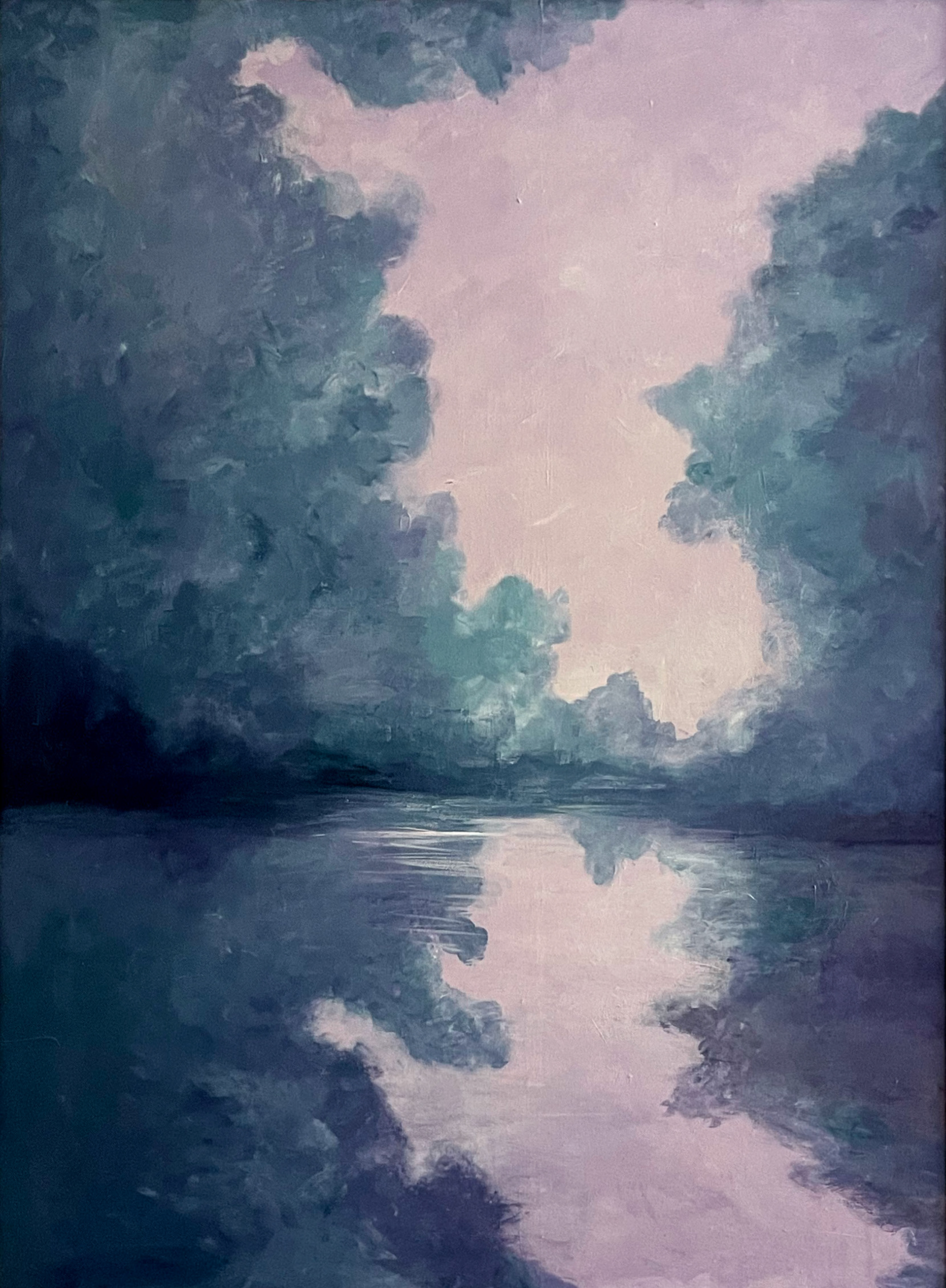 Painted during Linda Modica’s Long Island period, Stillness After Light reflects an early engagement with Impressionist approaches to atmosphere, reflection, and light. Inspired by the work of Claude Monet, the painting interprets landscape through layered color, softened edges, and intuitive brushwork rather than direct representation.