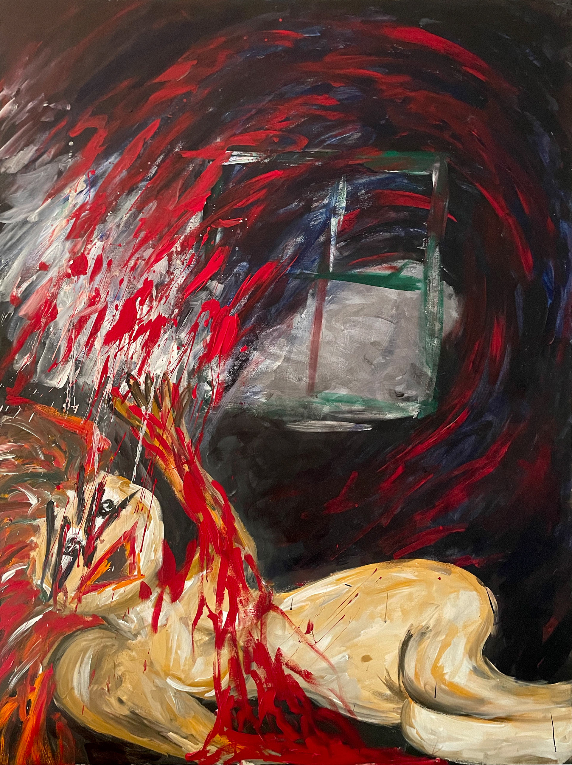 The work draws from a long-standing dream of inescapable water—a tidal wave that returns across decades, blurring the line between imagined threat and lived experience. Painted in the basement of the artist’s Long Island home after waking from the dream, The Nightmare reflects an early engagement with deconstructed cubism as a means of confronting internal states rather than external scenes.